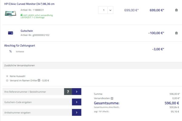 Bei Office-Partner bekommt ihr gerade den HP E344c Curved Monitor (34″) 86,36 cm VA, HDMI, Displayport, 4ms Reaktionszeit, WQHD 3440 x 1440 für 599€ (Vergleichspreis ~704€) Ersparnis ~105€