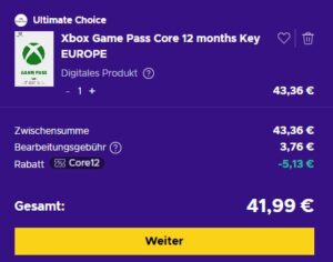 Bei Eneba erhaltet ihr jetzt wieder 12 Monate XBOX Game Pass Core zu einem günstigen Preis. 🙂 Aktuell erhaltet ihr 12 Monate XBOX Game Pass Core für 41,99€