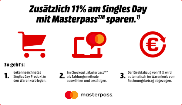 Zusätzlich bekommt ihr bei Zahlung mit Masterpass bis zu einem Einkaufswert von 200€ ganze 11% Rabatt auf alle Aktionsprodukte. Für alles über 200€ erhaltet ihr maximal 22€ Rabatt pro Bestellung!