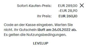 289,00 € – 28,90 € (Gutscheincode) macht 260,10 €.