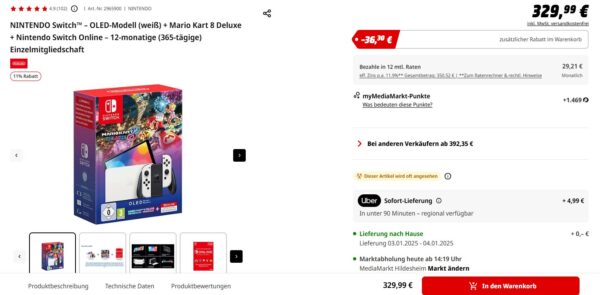 Noch auf der Suche nach einer Switch OLED, perfekt bei MediaMarkt bekommt ihr die NINTENDO Switch OLED-Modell + Mario Kart 8 Deluxe + Nintendo Switch Online – 12-Monate-Mitgliedschaft für 293,96€ (Vergleichspreis ~325€) Ersparnis ~31€