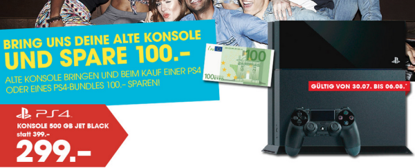 Aktion gültig von 30.07. bis 06.08.2015 auf alle lagernden PS4 Modelle – solange der Vorrat reicht. Nicht mit anderen Aktionen kombinierbar. Eine Bezahlung über Kauf auf Rechnung ist nicht möglich. Pro Person und Einkauf kann nur ein Stück der PS4-Konsole gekauft werden. Der Versand der PS4-Konsolen erfolgt ab Donnnerstag 30.07.15.