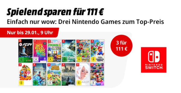 MediaMarkt bietet euch nun wieder die beliebte 3 Games für die Nintendo Switch zum Preis von 111€! Da schlägt das Gamer-Herz doch gleich viel höher oder? Der Einzelpreis pro Game liegt hierbei übrigens bei ~37€ 😉