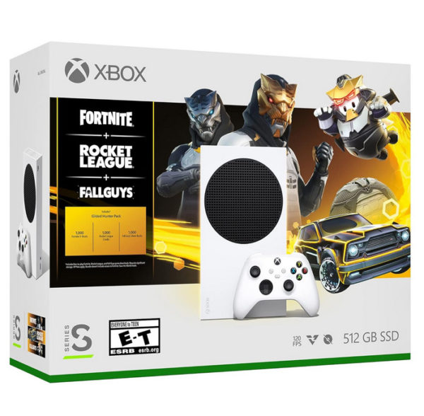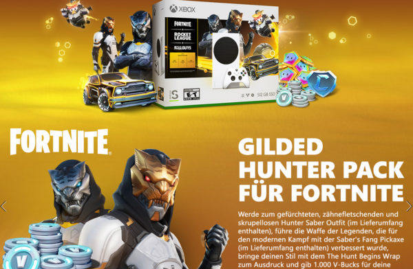 - Mit dem Xbox Series S -Gilded Hunter Bundle, das neun In-Game-Gegenstände und virtuelle Währung für Fortnite, Rocket League und Fall Guys enthält, kannst du dich richtig austoben.