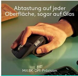 - 8K- DPI- Abtastung auf jeder Oberfläche: Mit der kabellosen Computermaus MX Master 3S können Sie auf jeder Oberfläche arbeiten – sogar auf Glas(1) – dank 8K- DPI- Sensor mit anpassbarer Empfindlichkeit