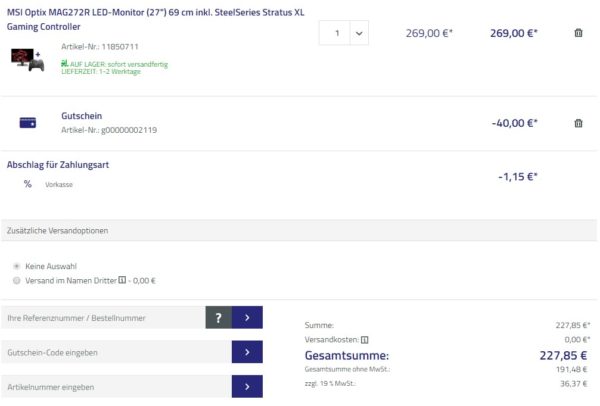 Neuer Monitor + Controller gesucht? Bei Office-Partner bekommt ihr heute den MSI Optix MAG272R LED-Monitor (27″) 69 cm FHD, 1920×1080, 16:9, VA, 1ms, 165Hz, DisplayPort, HDMI, USB-C + SteelSeries Gaming Controller für 229€ (Vergleichspreis ~314€) Ersparnis ~85€