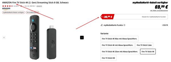 Alternativ gibt es auch den regulären 4K Stick (nicht die Max-Variante) als Versandrückläufer / Warehouse-Deal bei Amazon für 37,99€.