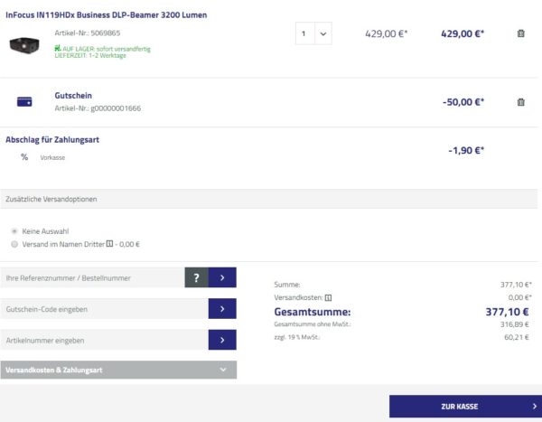 Der Beamer wird seitens Office-Partner versandkostenfrei geliefert.