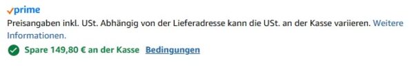TIPP | Als PRIME-Mitglied von Amazon erhaltet ihr den Versand für einen Großteil des Sortiments bereits ohne das Erreichen von 39€ GRATIS! Amazon PRIME könnt ihr (HIER) 30 Tage (bzw. als Student oder Auszubildender 6 Monate) lang absolut kostenlos testen. Im Anschluss an den kostenlosen Testzeitraum kostet Amazon PRIME 89,90€/Jahr, bzw. 8,99€/Monat). Studenten, Auszubildende, rundfunkbeitragsbefreite Kunden oder Kunden mit Sozialpass (HIER) zahlen 44,90€/Jahr, bzw. 4,49€/Monat.