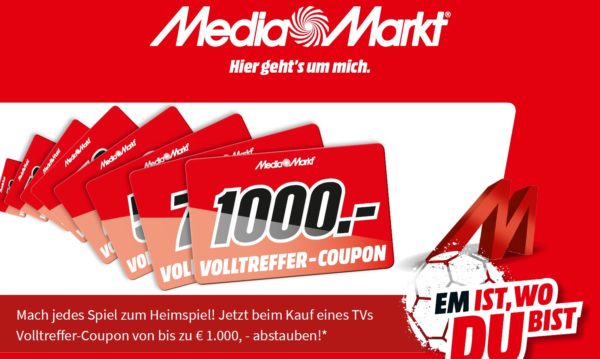 Bei MediaMarkt ist gerade einen neuer Flyer gestartet passend zur anstehenden Fußball-EM, bei dem ihr beim Kauf eines ausgewählten TV´s einen Coupon bis 1.000€ on top bekommt.