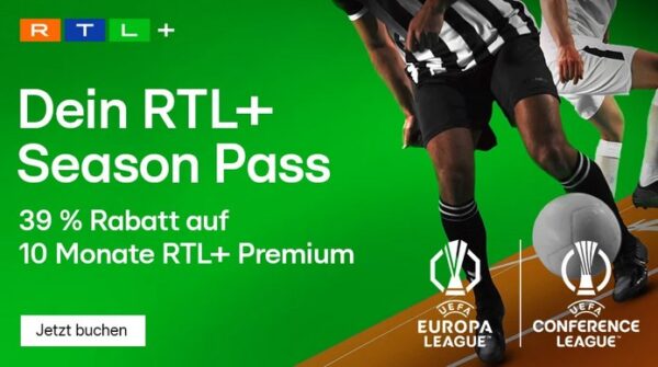 Mit dem RTL+ Season Pass jetzt 39% sparen und für nur 54,99€ die gesamte UEFA Europa League und UEFA Conference League verfolgen und alle Vorteile von RTL+ Premium genießen. Auf RTL+ sehen American Football Fans zusätzlich jeden Sonntag bis zu 3 NFL Spiele live. Außerdem präsentiert RTL+ an jedem Gameday ab 18:40 Uhr eine Partie, die exklusiv auf der All Inclusive Entertainment App zu sehen ist. Darüber hinaus ist der Zugriff auf alle weiteren Inhalte von RTL+ Premium, wie z.B. Originals, exklusive Serien und Pre-TV beliebter TV-Formate, im Season Pass enthalten