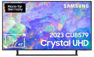 - Lieferumfang: 1 x Samsung Crystal CU8579 Fernseher 43 Zoll, Smart TV, Inkl. Fernbedienung Solar Smart Remote, GU43CU8579UXZG, Deutsches Modell [2023]