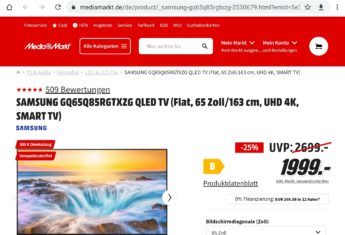 Denn bei MediaMarkt bekommt man den Samsung GQ65Q85RGTXZG QLED-TV (Flat, 65″, 4K/UHD, Smart-TV) für 1.699€ (Vergleichspreis: ~1.894€) Ersparnis ~195€.