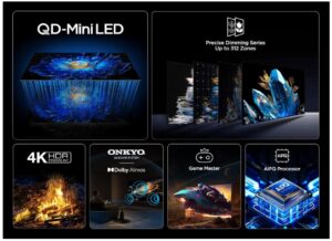 - QD-Mini-LED: Die einzigartige Hintergrundbeleuchtungstechnologie sorgt für ein visuelles Meisterwerk, das erstaunlich lebendige Bilder mit naturgetreuen Farben und einem ultrahohen Kontrastverhältnis bietet. Darüber hinaus bietet es eine höhere Spitzenhelligkeit, eine größere Farbskala, eine größere Bildschirmgröße und eine längere Lebensdauer an. Sie ist die fortschrittlichste Bildschirmtechnologie.