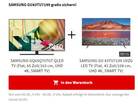 Bei MediaMarkt bekommt ihr heute ein richtig fettes TV-Bundle, bestehend aus einem 65“ Samsung QLED + 43“ Samsung LED TV für 1.367,63€ (Vergleichspreis ~1.675€) Ersparnis ~307€