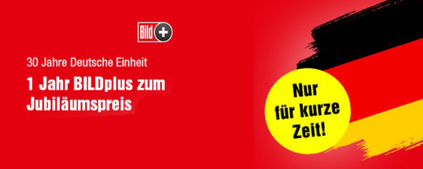 Im Rahmen der Aktion zum 30. Tag der deutschen Einheit gibt es bis einschließlich Sonntag (04.10.2020) 12 Monate BILDplus für einmalig 30€ (regulärer Preis: ~80€) Ersparnis ~50€
