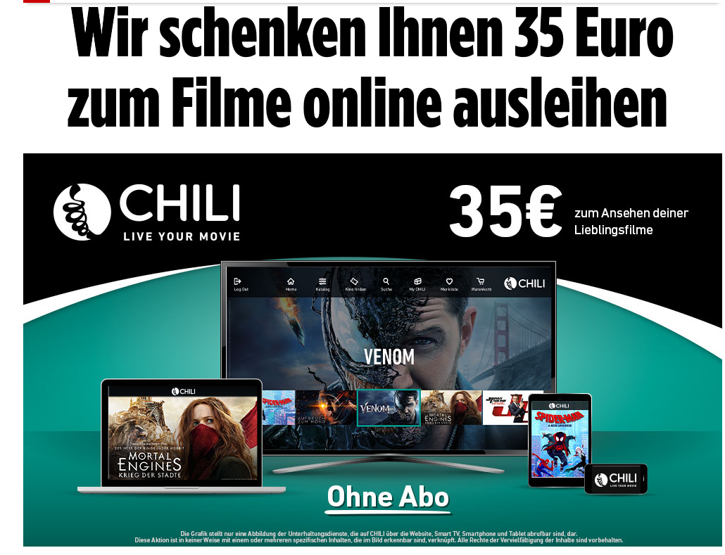 Mit der neuen Streaming-Plattform CHILI hast du sofort Zugriff auf Filme und TV-Sendungen. Nur bei BILDplus gibt's jetzt satte 35 Euro zum Ansehen deiner Lieblingsfilme…