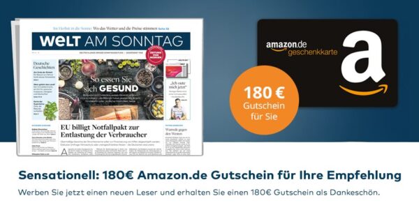 Dank einer Aktion gibt es einen 180€ Amazon.de Gutschein für die Empfehlung des Welt am Sonntag Jahresabos von 287,88€.