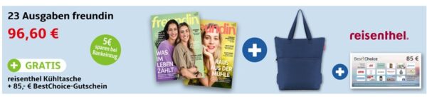 23 Ausgaben „freundin“ für 91,60€ + 85€ Prämie + GRATIS reisenthel Kühltasche