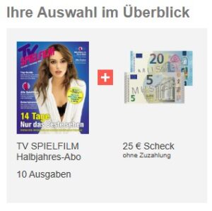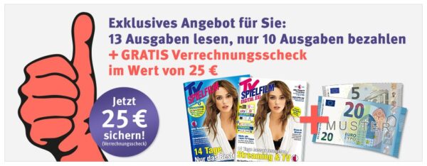 Momentan könnt ihr euch 13 Ausgaben TV Spielfilm / TV Spielfilm XXL für 29€ + 25€ Prämie sichern.