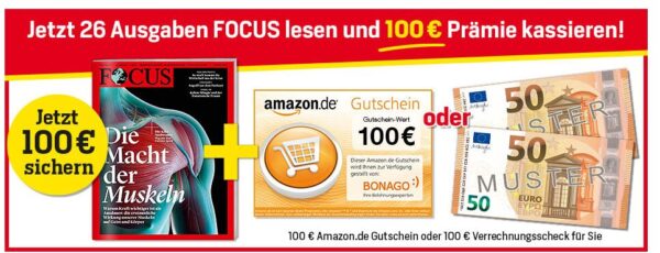 Direkt bei der Focus gibt es 26 Ausgaben Focus für 135,20€ , zusätzlich erhaltet ihr aber einen 100€ Amazon.de Gutschein oder einen 100€ Verrechnungsscheck ONTOP