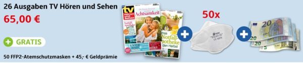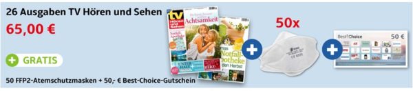 26 Ausgaben TV Hören & Sehen für 65€ + 50 FFP2 Masken + 50€ Best-Choice Gutschein als Prämie