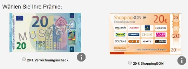- 20€ Prämie (Verrechnungsscheck oder ShoppingBON)