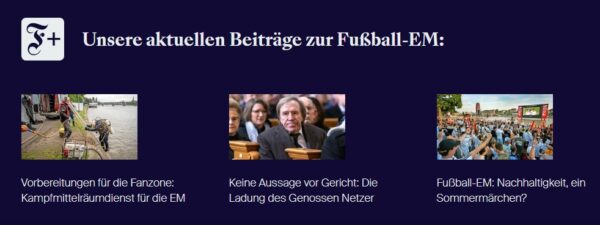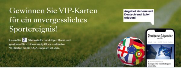 Zur EM bekommt ihr von F+ der Frankfurter Allgemeine Zeitung ein FAZ+ Miniabo 3 Monate lang für je nur 4€/Monat (statt: ~12€/Monat) Ersparnis ~24€