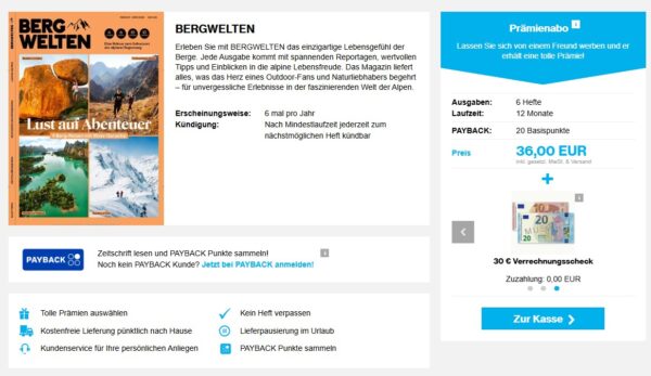 Bei BurdaDirect bekommt ihr gerade 6 Ausgaben Bergwelten für 36€ inkl. 30€ Verrechnungsscheck oder Gutschein oder 2.000 Payback Punkte.