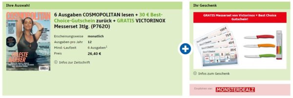 Bei Hobby & Freizeit gibt es 6 Monate Cosmopolitan für 26,40€ + GRATIS 3-tlg. Messer-Set von Victorinox + 30€ BestChoice-Gutschein