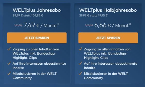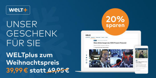Bis einschließlich 24. Dezember gibt es 6 Monate WELTplus für 6,66€/Monat. Dafür erhaltet ihr Zugriff auf ALLES, was euch ohne den Premium-Account verweigert bleiben würde. Der reguläre Preis beträgt ~10€/Monat sodass sich hier einiges sparen lässt. 🙂