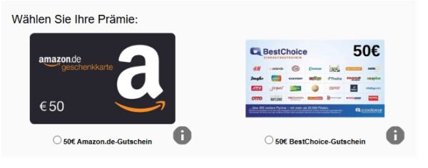 - in Form eines 50€ Amazon.de Gutschein* oder BestChoice-Gutschein