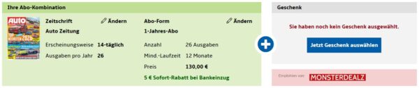Bei Hobby + Freizeit gibt es das Auto Zeitung Jahresabo für 125€ + bis zu 120€ Prämie.