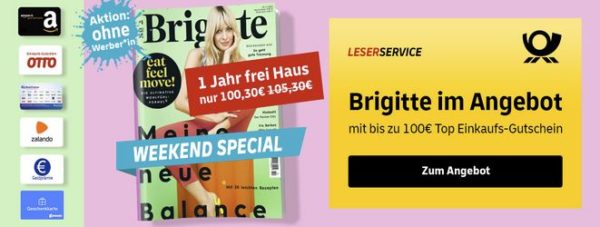 Beim LeserService der Deutschen Post erhaltet ihr als Weekend-Special bis einschließlich 16. Januar, 12 Uhr das Brigitte Jahresabo für 100,30€ + bis zu 100€ Prämie