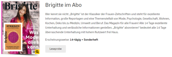Denn beim Leserservice bekommt man die Brigitte Zeitschrift (Jahresabo) für 82,13€ inkl. 90€ Prämie.
