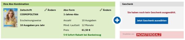 Bei Hobby + Freizeit gibt es das COSMOPOLITAN Jahresabo für 56,50€ + bis zu 60€ Prämie.