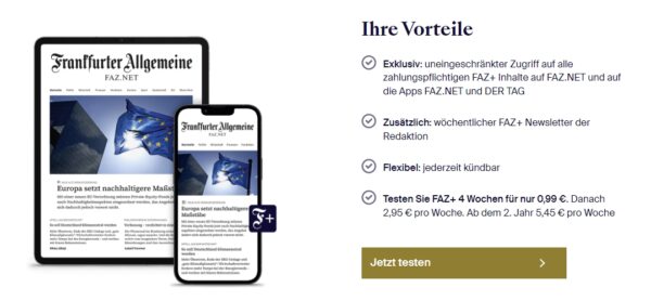 - Teste FAZ+ 4 Wochen für nur 0,99€ – Danach 2,95€ pro Woche – Ab dem 2. Jahr 5,4 € pro Woche