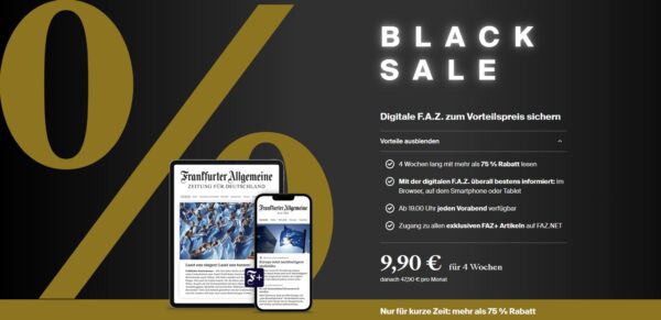 Neuer Deal der Frankfurter Allgemeinen Zeitung, dort könnt ihr euch jetzt das F.A.Z. Mini-Abo im Blacksale mit 78% Rabatt für nur 9,90€ sichern