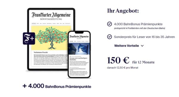 Jetzt gibt es genau den passenden Deal für die jungen Leser unter euch (16-35 Jahre) und die auch gern die Bahn nutzen, die F.A.Z. (Frankfurter Allgemeine Zeitung) dürfte eigentlich den meisten, deutschlandweit ein Begriff sein. Aktuell erhaltet ihr bei der F.A.Z. als Special das & F.A.S 12-Monatsabo zum Sonderpreis von nur 150€, zusätzlich bekommt ihr noch 4.000 BahnBonus Prämienpunkte on top das entspricht 4 Freifahrten mit der Deutschen Bahn.