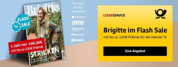 Beim LeserService der Deutschen Post erhaltet ihr im Flash-Sale bis einschließlich 31. Oktober, 12 Uhr das Brigitte Jahresabo für 100,30€ + bis zu 100€ Prämie!