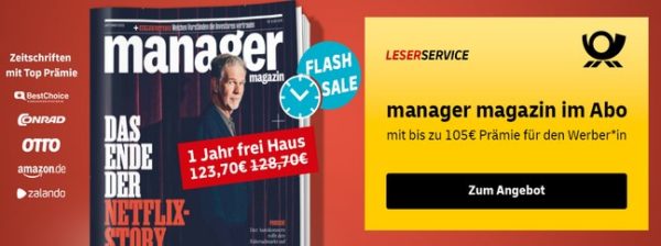 Beim LeserService der Deutschen Post erhaltet ihr im Flash-Sale bis einschließlich 10. Oktober, 12 Uhr das manager magazin Jahresabo für 123,70€ + bis zu 105€ Prämie!