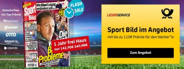 Beim LeserService der Deutschen Post erhaltet ihr im Flash-Sale bis einschließlich 14. Oktober, 12 Uhr das Sport Bild Jahresabo für 142,90€ + bis zu 110€ Prämie!