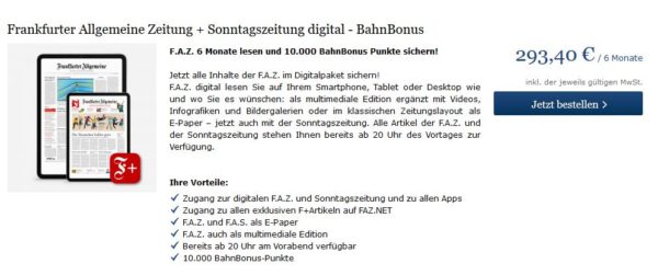 Frankfurter Allgemeine Zeitung + Sonntagszeitung digital (6 Monate) inkl. 10.000 BahnBonus-Punkten für 293,40€