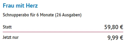 Bei KioskNEWS bekommt man das Frau mit Herz (Halbjahresabonnement) für 9,99€ (statt ~60€) Ersparnis ~50€