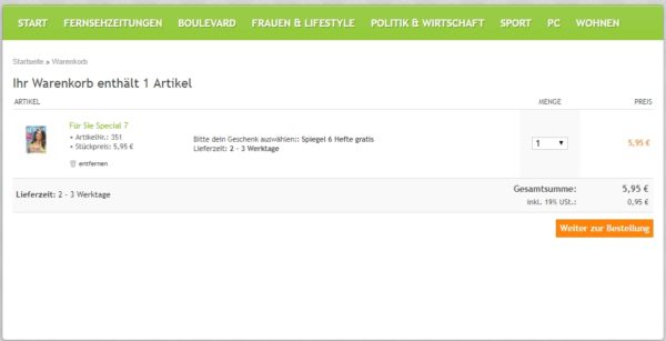 Außerdem bekommt man noch ein Geschenk, welches man sich aussuchen kann, aber nicht muss. So bekommt man weitere Zeitschriften wie Auto Bild (6 Hefte), Die Zeit (6 Hefte), Manager Magazin (3 Hefte) oder die Sport Bild (6 Hefte) obendrauf.