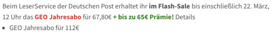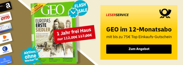 Beim LeserService der Deutschen Post erhaltet ihr im Flash-Sale bis einschließlich 22. März, 12 Uhr das GEO Jahresabo für 112€ + bis zu 75€ Prämie!