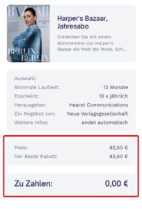 Richtig schöner Deal, bei das-beste-Abo bekommt ihr das Jahresabo Harper’s Bazaar KOMPLETT GRATIS (statt 82,50€) + selbstkündigend