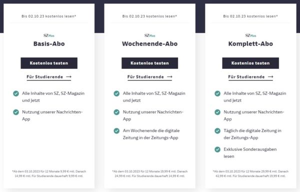 Ihr seid gerne bestens über die aktuellen Geschehnisse auf der Welt informiert? Ich denke, dann haben wir etwas Passendes für euch! 😉 Denn bis einschließlich 2. Oktober könnt ihr die 3 Abo-Modelle der SZ komplett GRATIS testen! Je früher ihr einsteigt umso mehr profitiert ihr davon. Eine Kündigung ist jeder Zeit bis spätestens 2. Oktober möglich womit man also quasi kein Risiko eingeht. 🙂