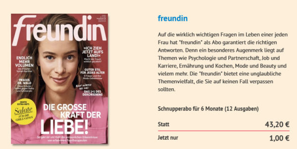 Bei Presseshop gibt es als Schnupperabo das Halbjahresabo „freundin“ für 1€ statt 43,20€. Außerdem lässt sich das Ganze per Paypal bezahlen.