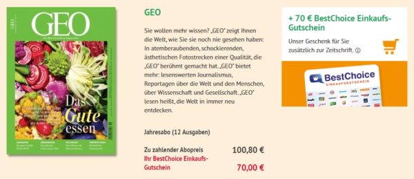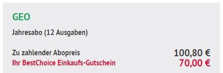 Bei KioskNEWS bekommt ihr das 3 Monate GEO Zeitschrift für 100,80€ + 70€ Gutschein.